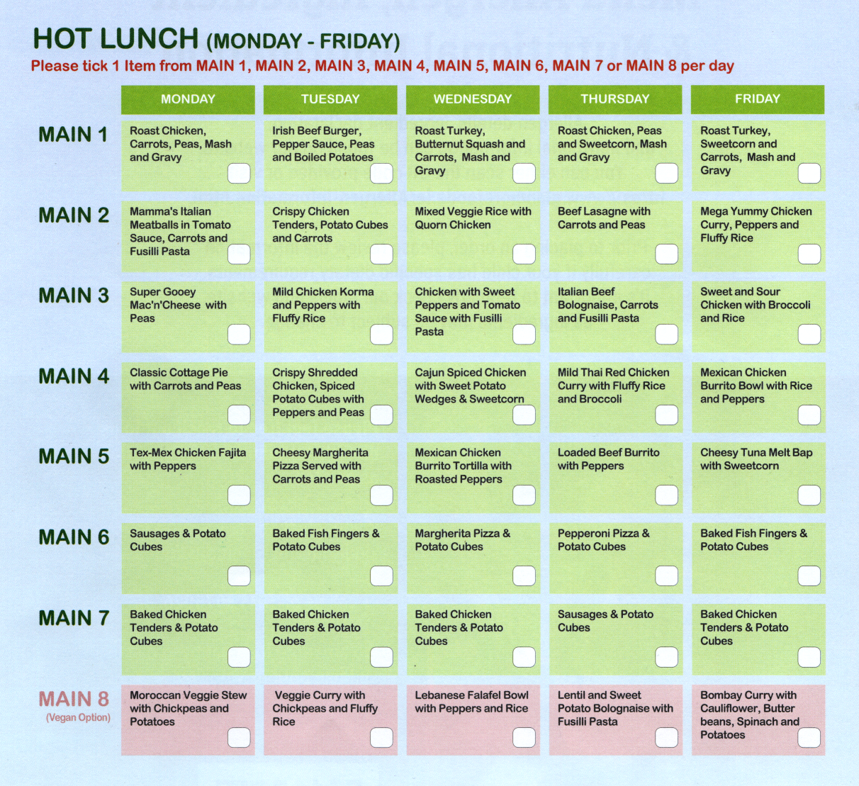 We sent an email before the break to let you know we would be changing our menu to move to a compliant menu in line with the Healthy Ireland guidelines as set out by the Department of Social Protection. We also communicated that we would set up a default menu, so no child is left without a meal on the first few days of school. It was decided to rotate the default menu options, however after feedback from schools and parents today we understand this has caused some confusion and frustration, this was not our intention and we will revert to Baked Potato and Beans as the default option every day until the student has selected their menu.